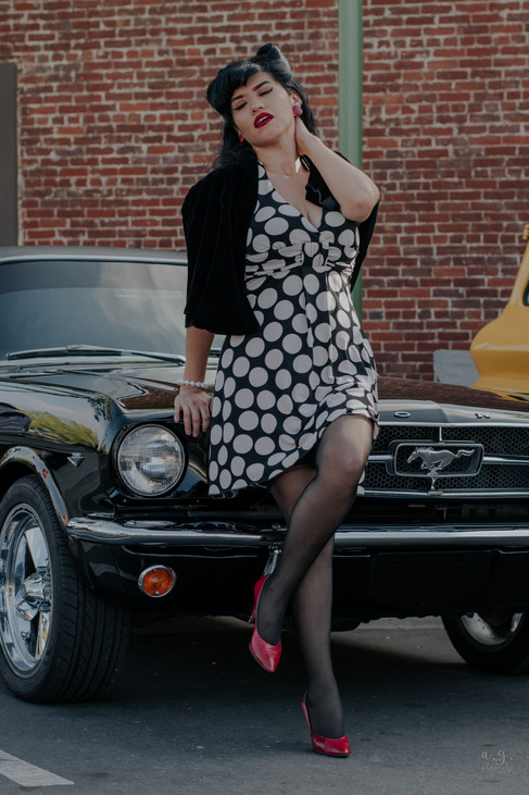 We shot in Downtown Escondido during the Cruisin' Grand event. We started out shooting in a Classic Mustang, then outside of it. Stacy's red shoes matched the Mustang's red stripe. Which was great! We then moved onto a couple surrounding classic cars. Posing with rad red Chevy Bel Air and posing in an awesome Porsche Targa. Stacy killed modeling with both of them.