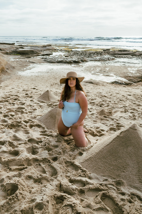 It started off not good. I had completely forgot about spring break, La Jolla Cove, the original beach I wanted to shoot at was packed with people! And had absolutely no parking! Thank goodness I had arrived about 45 minutes before our meet up time, because I had enough time to drive around to find parking and scout out the other beach areas in La Jolla that were less packed. I ended up finding parking by the La Jolla Tide Pools. Which also happened to have far less people, so SCORE! Another not so good start to the shoot, was that it was gloomy. Cloudy and gray. The trusty - not so trust- weather app said, sunny, on the drive to the location. It was not sunny. But nonetheless, we continue on. When Sarah and Jordan arrived, Sarah went off to change into the first bathing suit (turquoise one piece), and Jordan helped me set up the blanket and props. With some luck, the sun came out for a few minutes! However, it quickly went back behind the clouds. Take note of the first 4 photos in the one piece bathing suit lighting. It's bright and colorful! Then take note at the remaining photos, including the ones with the two piece bathing suit, when the sun went away. Those photos are more moody. Which was totally fine... you make do with what you got! To which I did just that and captured some amazing photos! Plus, the beautiful purple flowers made up for the gloomy sky! Despite some obstacles, it was such a fun shoot! It was nice to finally meet Jordan, a fellow photographer, who I have been following for quite some time now. And to work with together on this shoot. She was a blast to work with, and to brain storm off of. As well as, learn different tips and trick from each other!